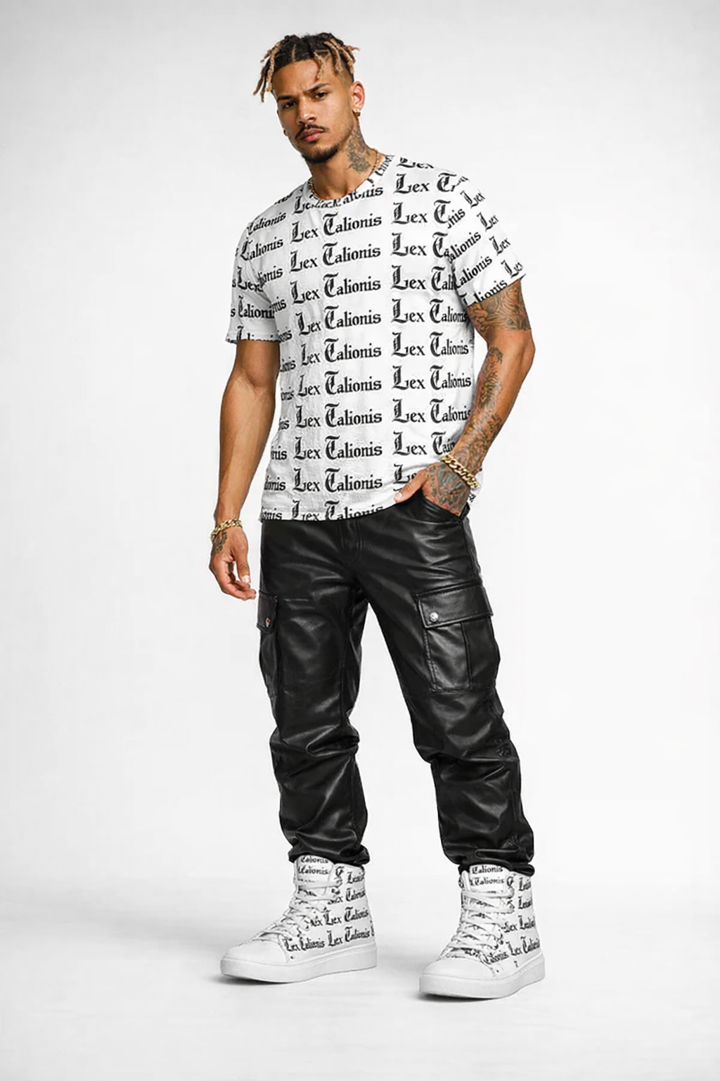 The LEX Script High-Top Canvas Shoes bring typography into motion, using the Lex script as more than decoration — as presence. Wrapped around a classic high-top silhouette, the script pattern reads like a quiet signature: deliberate, confident, and unmistakably Lex Talionis.